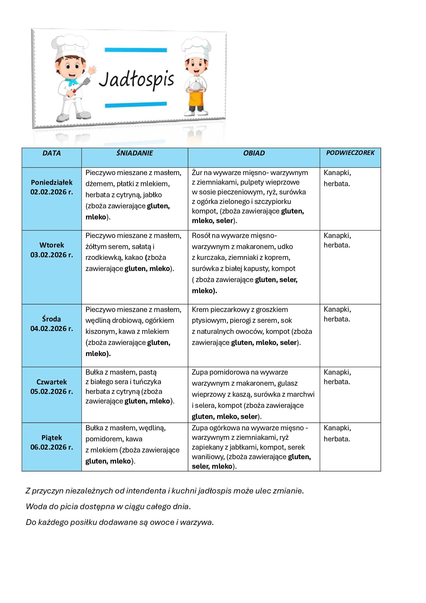 Jadłospis dla Przedszkola w Przykonie na 2 - 6 lutego 2026 r.