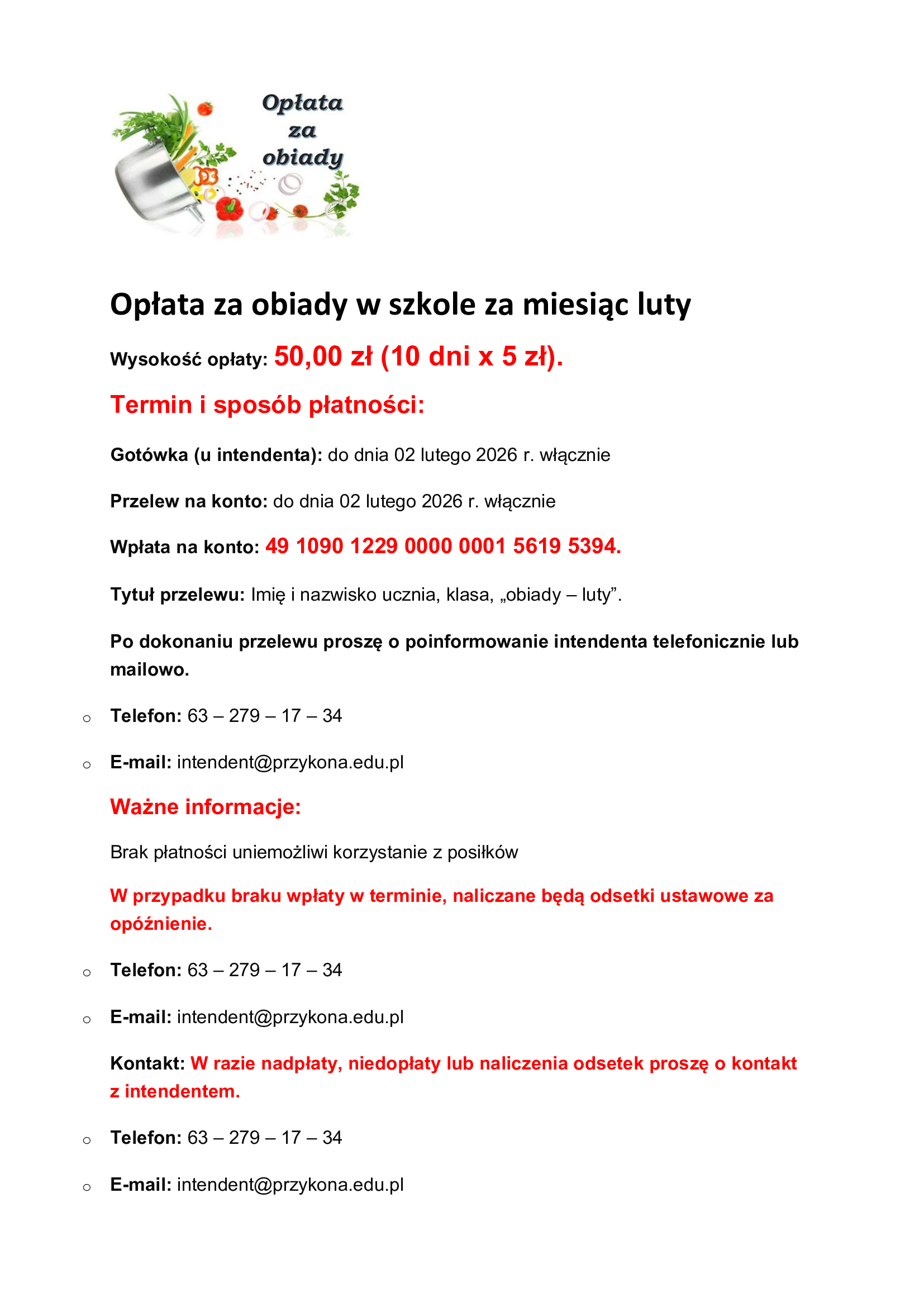 Opłata za obiady w Szkole Podstawowej w Przykonie w lutym 2026 r.