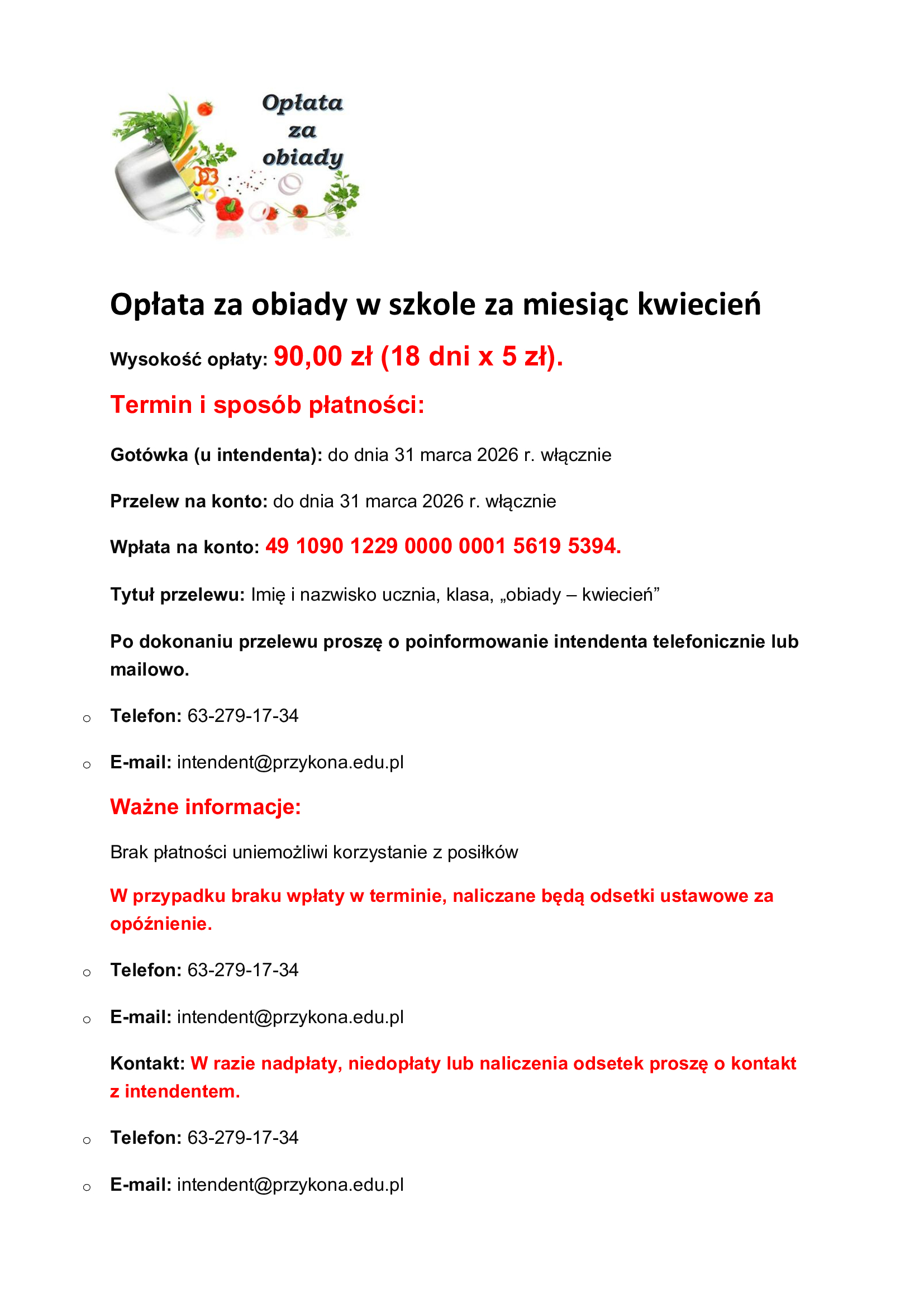 Opłata za obiady w Szkole Podstawowej w Przykonie w kwietniu 2026 r.
