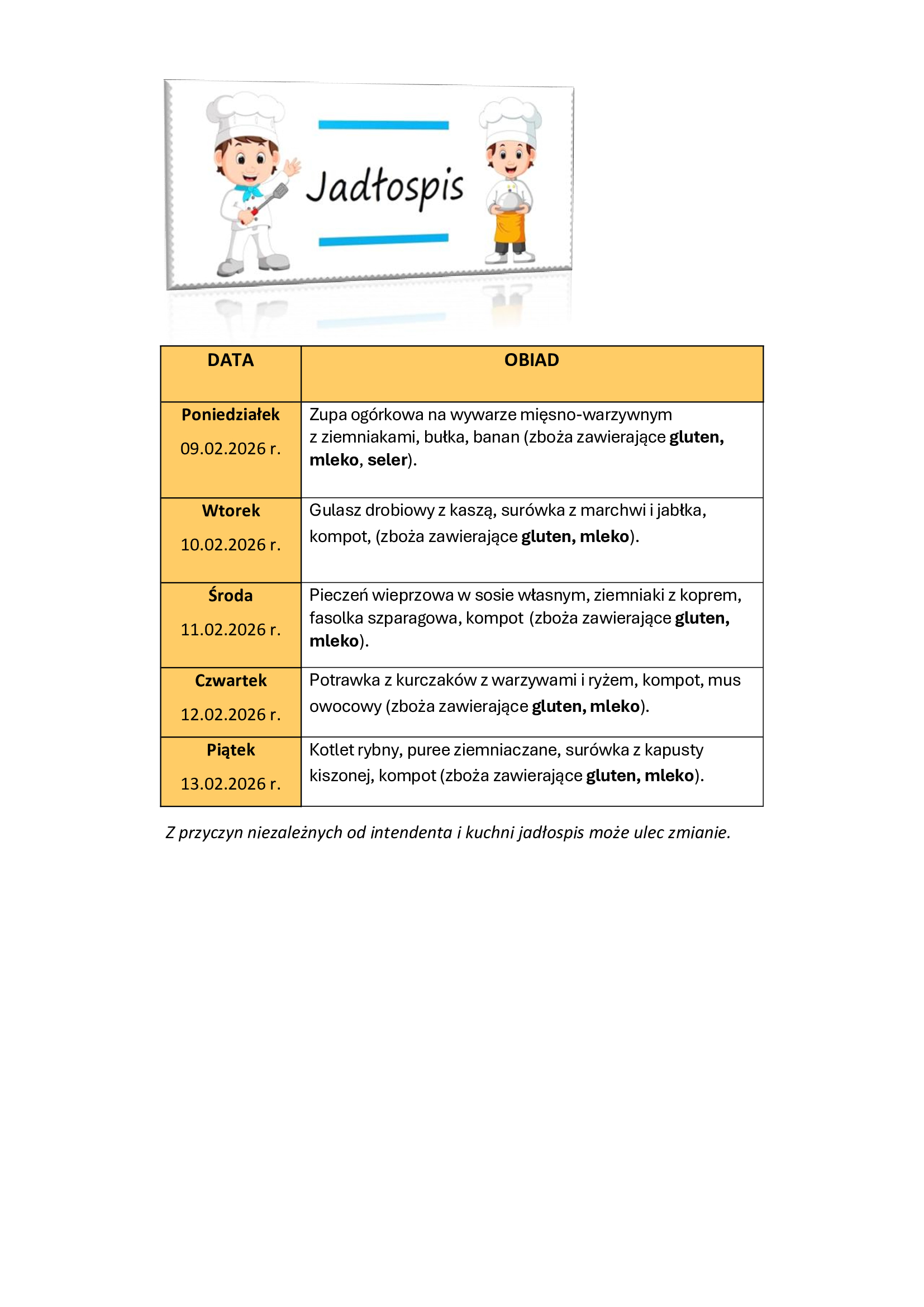 Obiady dla Szkoły Podstawowej na 9 -13 lutego 2026 r.